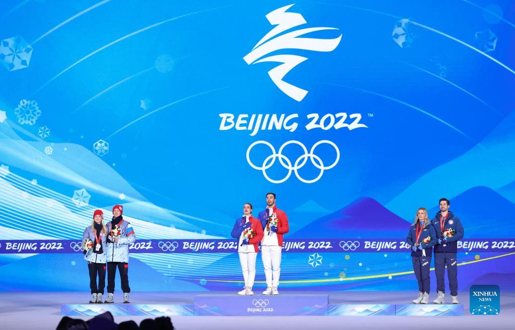 Gold medalists Gabriella Papadakis/Guillaume Cizeron (C) of France, silver medalists Victoria Sinitsina/Nikita Katsalapov (L) of ROC and bronze medalists Madison Hubbell/Zachary Donohue of the United States react during the awarding ceremony of figure skating ice dance free dance at the Beijing Medals Plaza of the Winter Olympics in Beijing, capital of China, Feb. 14, 2022. (Xinhua/Yang Lei)