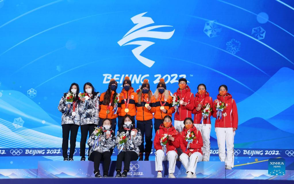 Gold medalists of the Netherlands pose during the awarding ceremony of short track speed skating women's 3000m relay at the Beijing Medals Plaza of the Winter Olympics in Beijing, capital of China, Feb. 14, 2022. (Xinhua/Cao Can)