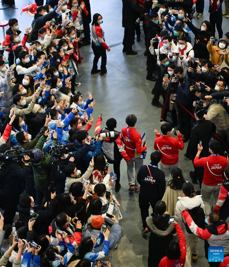 Figure skating athlete Hanyu Yuzuru of Japan goes to attend a press conference at the Main Media Center for Beijing 2022 Winter Olympics in Beijing, capital of China, Feb. 14, 2022. (Xinhua/Li Ga)