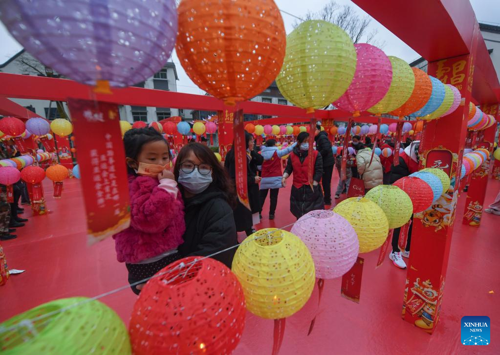 Residents take part in a riddle guessing activity to celebrate the upcoming Lantern Festival in the ancient town of Shouchang in Jiande, east China's Zhejiang Province, Feb. 14, 2022. (Xinhua/Xu Yu)