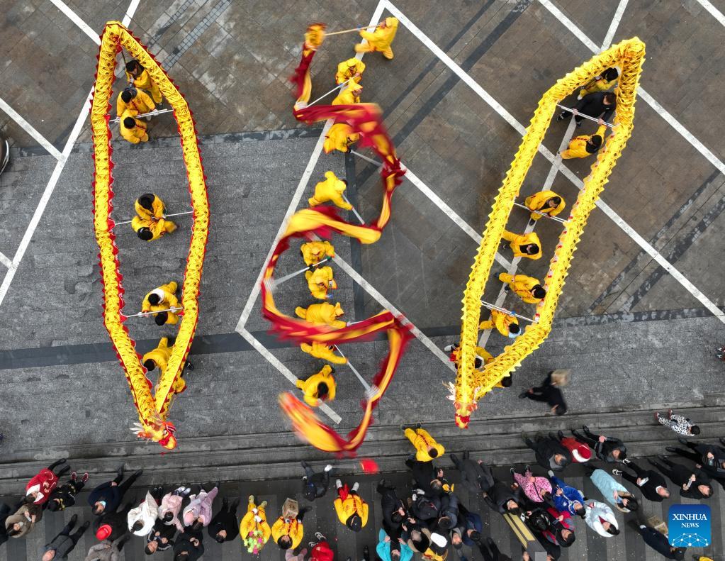 People perform dragon dance to celebrate the upcoming Lantern Festival in Wenling, east China's Zhejiang Province, Feb. 14, 2022. The Lantern Festival, the 15th day of the first month of the Chinese lunar calendar, falls on Feb. 15 this year. (Photo by Jiang Wenhui/Xinhua)