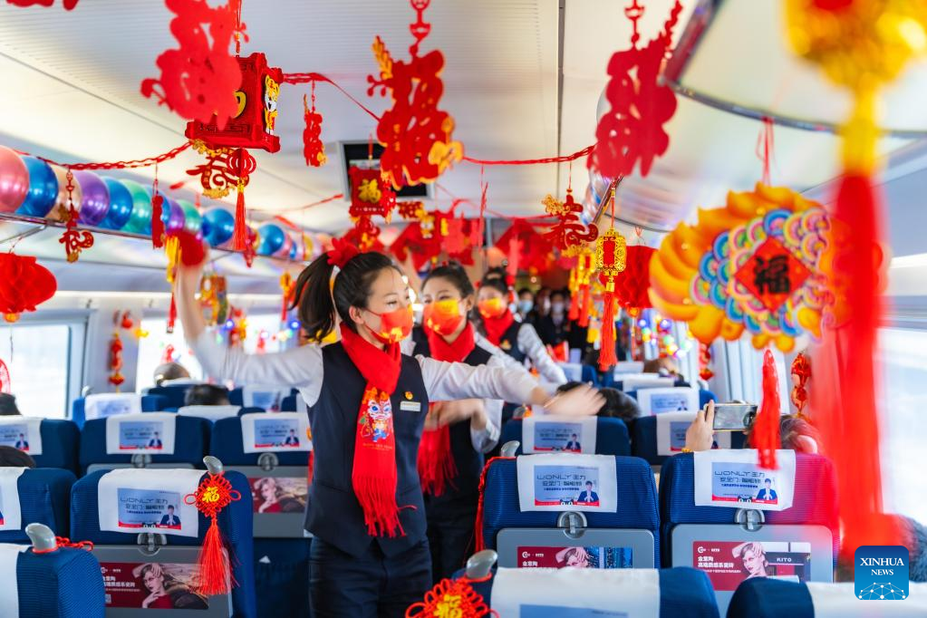 Crew members perform for passengers on a train to celebrate the upcoming Lantern Festival, Feb. 14, 2022. The Lantern Festival, the 15th day of the first month of the Chinese lunar calendar, falls on Feb. 15 this year. (Photo by Han Qingxiao/Xinhua)