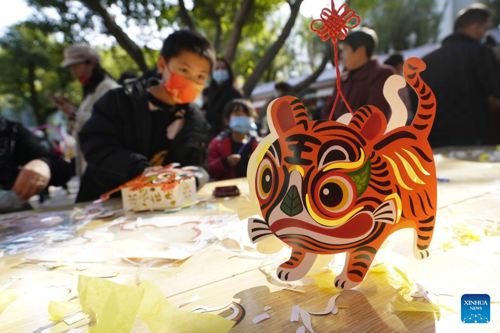 Children make Tiger lanterns at a community to celebrate the upcoming Lantern Festival in Wenzhou, east China's Zhejiang Province, Feb. 14, 2022. The Lantern Festival, the 15th day of the first month of the Chinese lunar calendar, falls on Feb. 15 this year. (Photo by Su Qiaojiang/Xinhua)