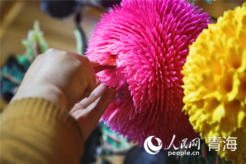 A monk artist makes a butter flower. (People’s Daily Online/Zhang Haopeng)