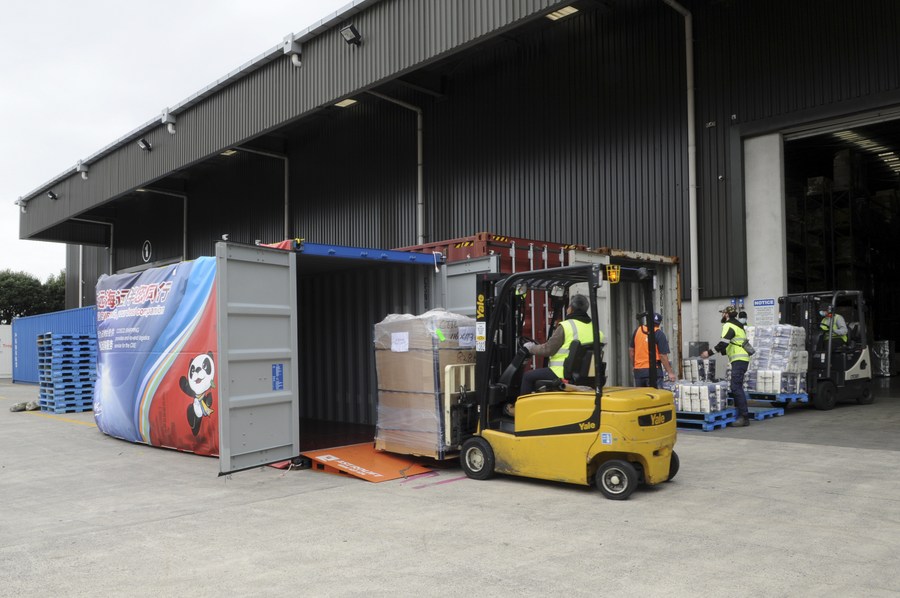 Products from New Zealand and Vanuatu are ready to be shipped to the fourth China International Import Expo (CIIE) from the Auckland port in New Zealand, Sept 25, 2021. [Photo/Xinhua]