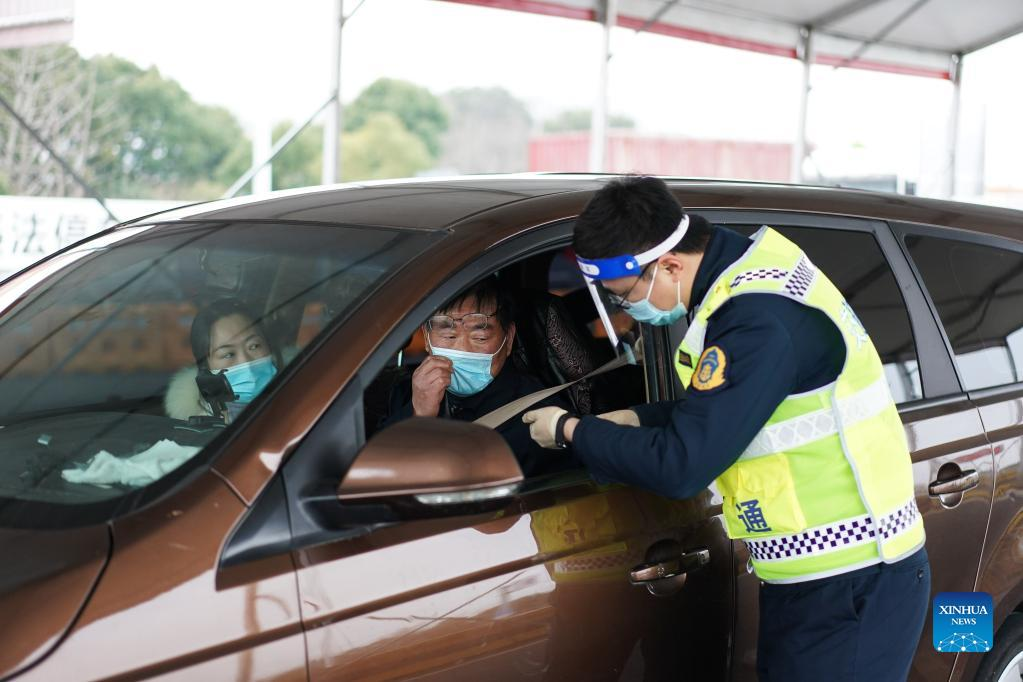 A staff member checks a vehicle at Suzhou New District toll station of Beijing-Shanghai Expressway in Suzhou, east China's Jiangsu Province, Feb. 15, 2022. Suzhou has closed 15 highway entrances and set up 31 highway exit inspection points in the whole city since Feb. 15. Drivers and passengers are required to carry proof of negative results from nucleic acid tests taken within the previous 48 hours, and green health codes. (Xinhua/Ji Chunpeng)