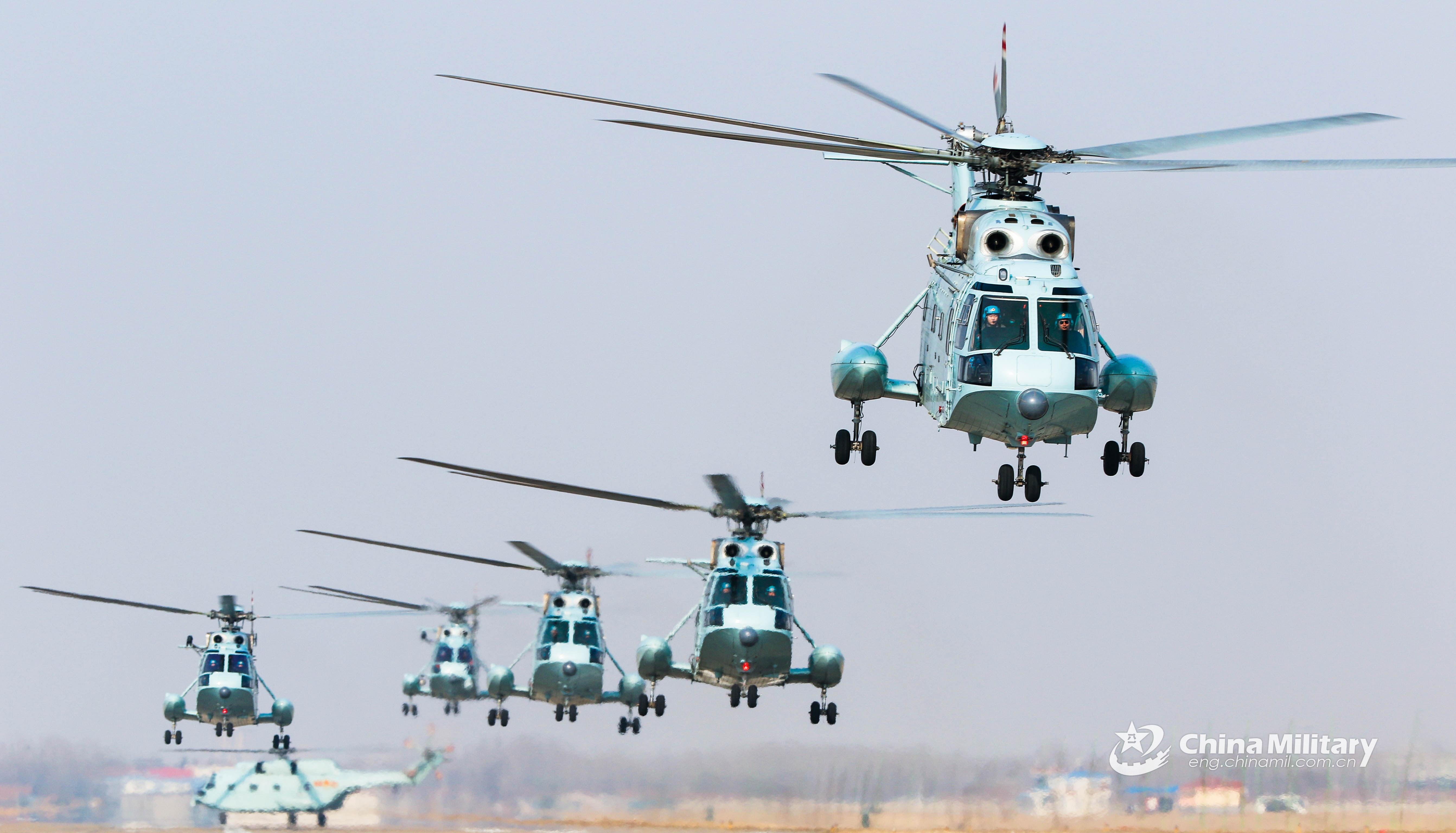 Ground crew members assigned to a brigade under the PLA Navy Marine Corps perform final inspections on a group of ship-borne helicopters prior to flight training on January 8, 2022. (eng.chinamil.com.cn/Photo by Cong Lianying)
