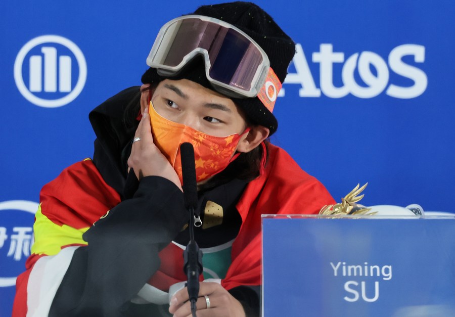 Su Yiming of China attends a press conference after the men's snowboard big air final of Beijing 2022 Winter Olympics at Big Air Shougang in Beijing, capital of China, Feb. 15, 2022. (Xinhua/Lan Hongguang)