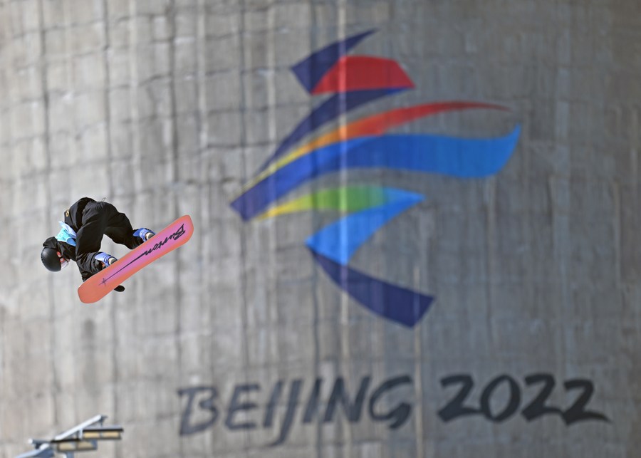 Su Yiming of China competes during the men's snowboard big air final of Beijing 2022 Winter Olympics at Big Air Shougang in Beijing, capital of China, Feb. 15, 2022. (Xinhua/Li Ga)