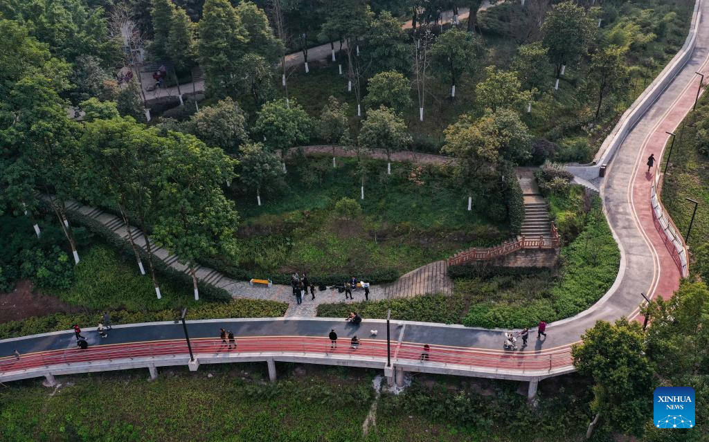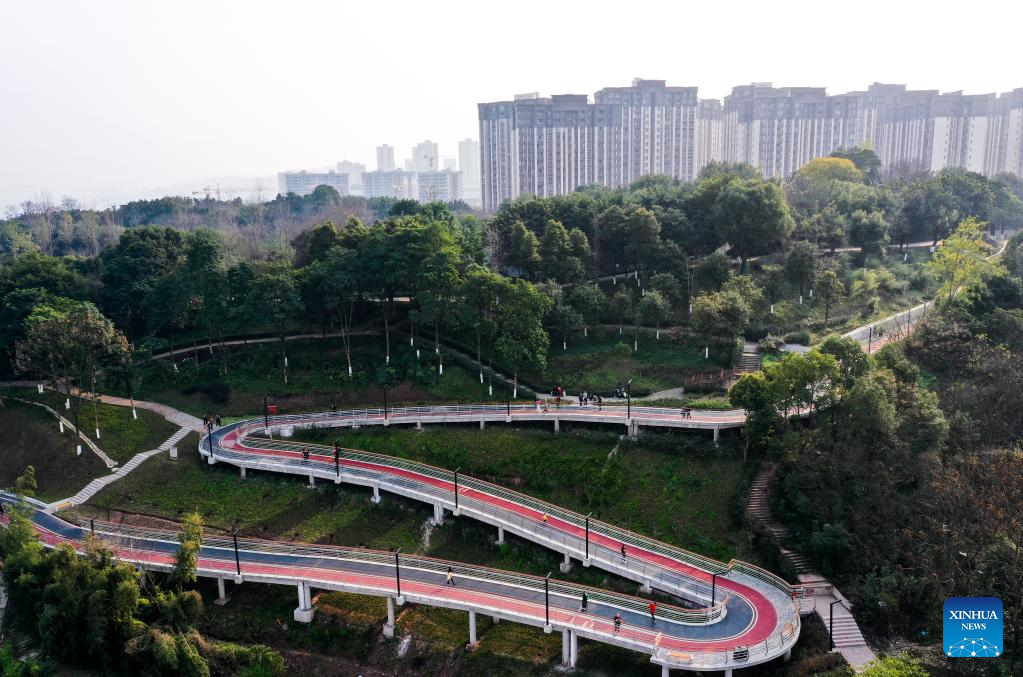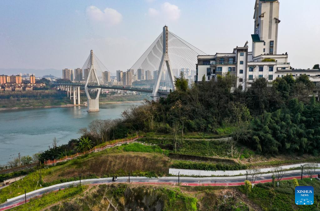 Aerial photo shows a view of a pavement at the former site of Chongqing Iron &Steel Factory in Dadukou District of southwest China's Chongqing Municipality, Feb. 15, 2022. The pavement is one of the 60 characteristic pavements planned by local authorities in the mountainous city of Chongqing. (Xinhua/Wang Quanchao)