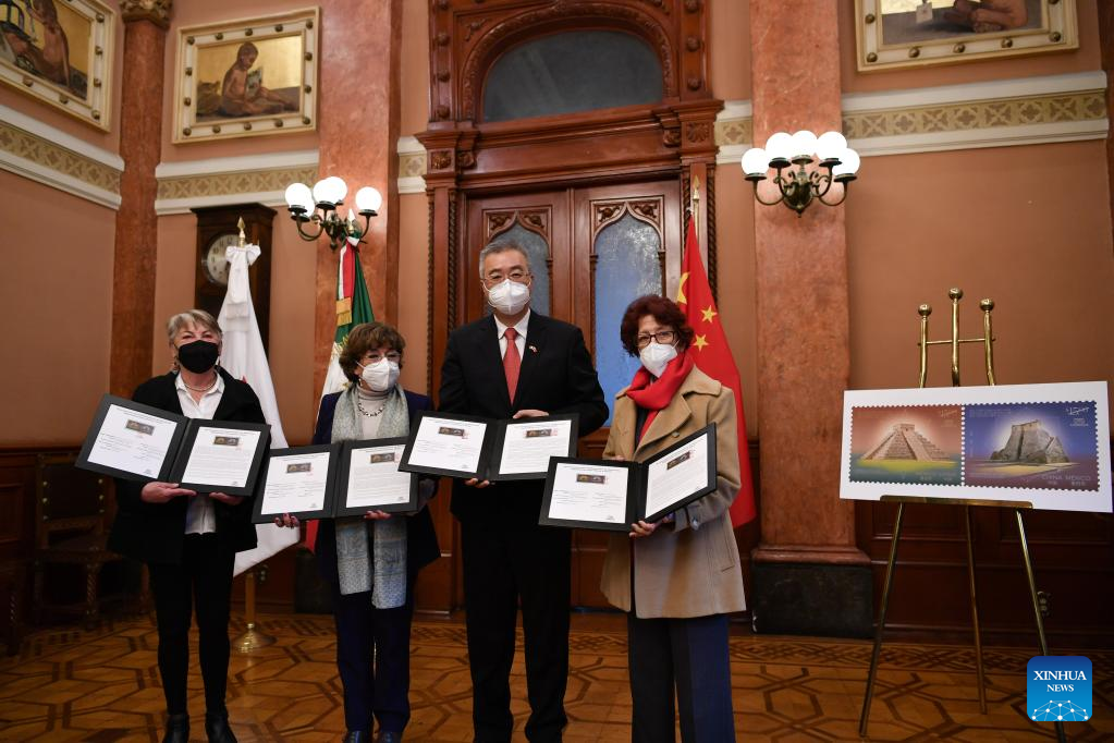 China's Ambassador to Mexico Zhu Qingqiao (2nd R) attends a ceremony on the issuance of a series of stamps to commemorate the 50th anniversary of the establishment of diplomatic relations between the two countries at the Postal Palace in the historic center of the capital Mexico City, Mexico, Feb. 14, 2022. The stamps showcase two historical and cultural landmarks: the Dengfeng Observatory in China's Henan Province, and the Pyramid of Kukulkan in Chichen Itza, Mexico. (Xinhua/Xin Yuewei)