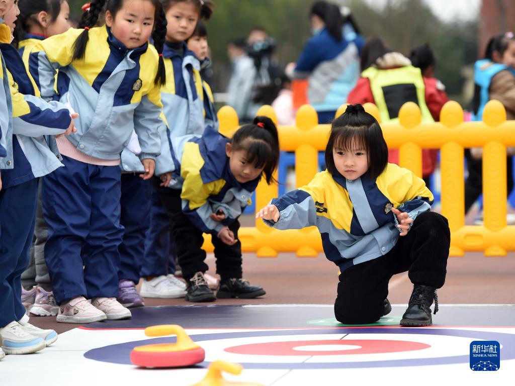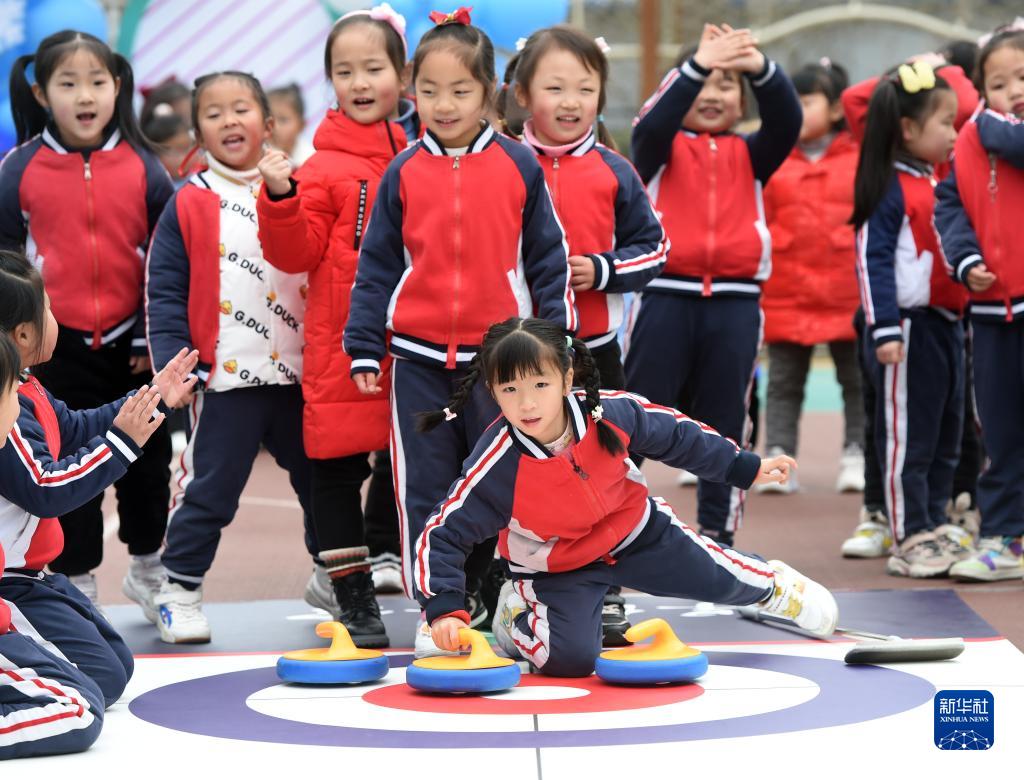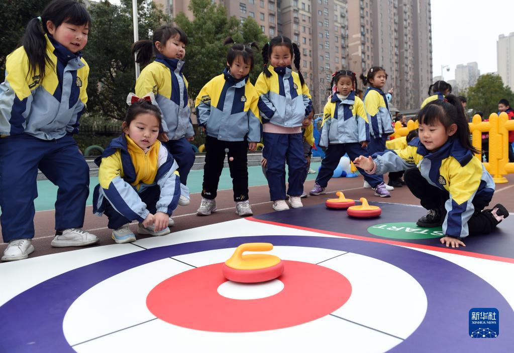 Kids in a kindergarten in Hefei, east China's Anhui Province experience “floor curling” at the opening ceremony on Feb. 16, 2022. A kindergarten in Hefei set up games such as “floor curling” and “floor hockey” on the first day of the new semester to offer kids an opportunity to learn about the Winter Olympic Games and experience the joy of sports. (Xinhua/Zhou Mu)
