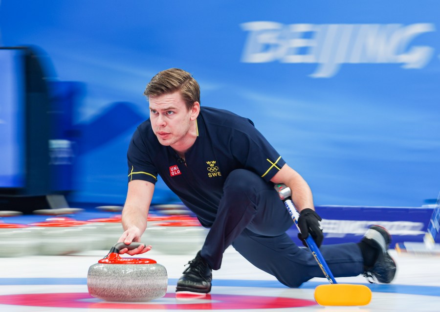 Christoffer Sundgren of Sweden competes in the curling men's semifinal against Canada at the Beijing 2022 Winter Olympics on Feb. 17, 2022. (Xinhua/Wang Jingqiang)