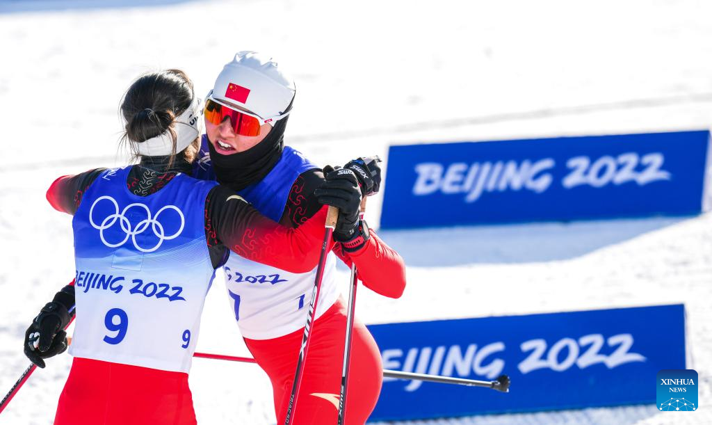 Bayani Jialin (R) of China hugs with her teammate after the cross-country skiing women's sprint free qulification match of Beijing 2022 Winter Olympics at Zhangjiakou National Cross-country Skiing Centre in Zhangjiakou, north China's Hebei Province, Feb. 8, 2022. (Xinhua/Wang Song)