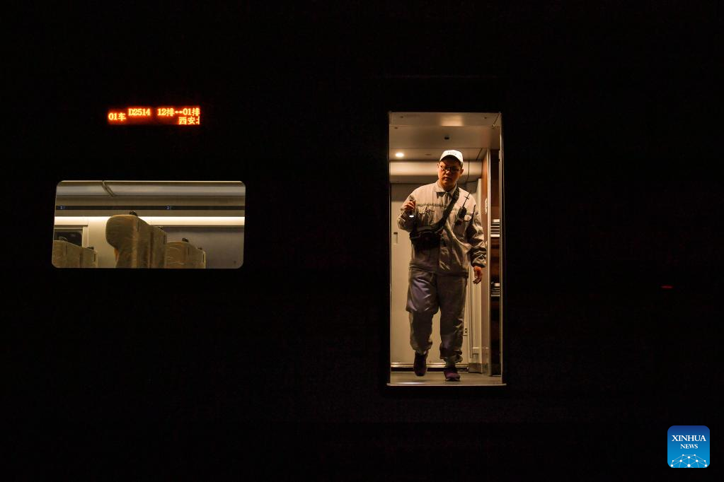 Railway mechanic Tian Sheng inspects a bullet train in Taiyuan, north China's Shanxi Province, Feb. 16, 2022. In spite of the cold weather, a maintenance team under China Railway Taiyuan Group Co., Ltd. inspects over 70 different types of electric multiple unit (EMU) trains on a daily basis to ensure that local bullet trains run smoothly. (Xinhua/Cao Yang)
