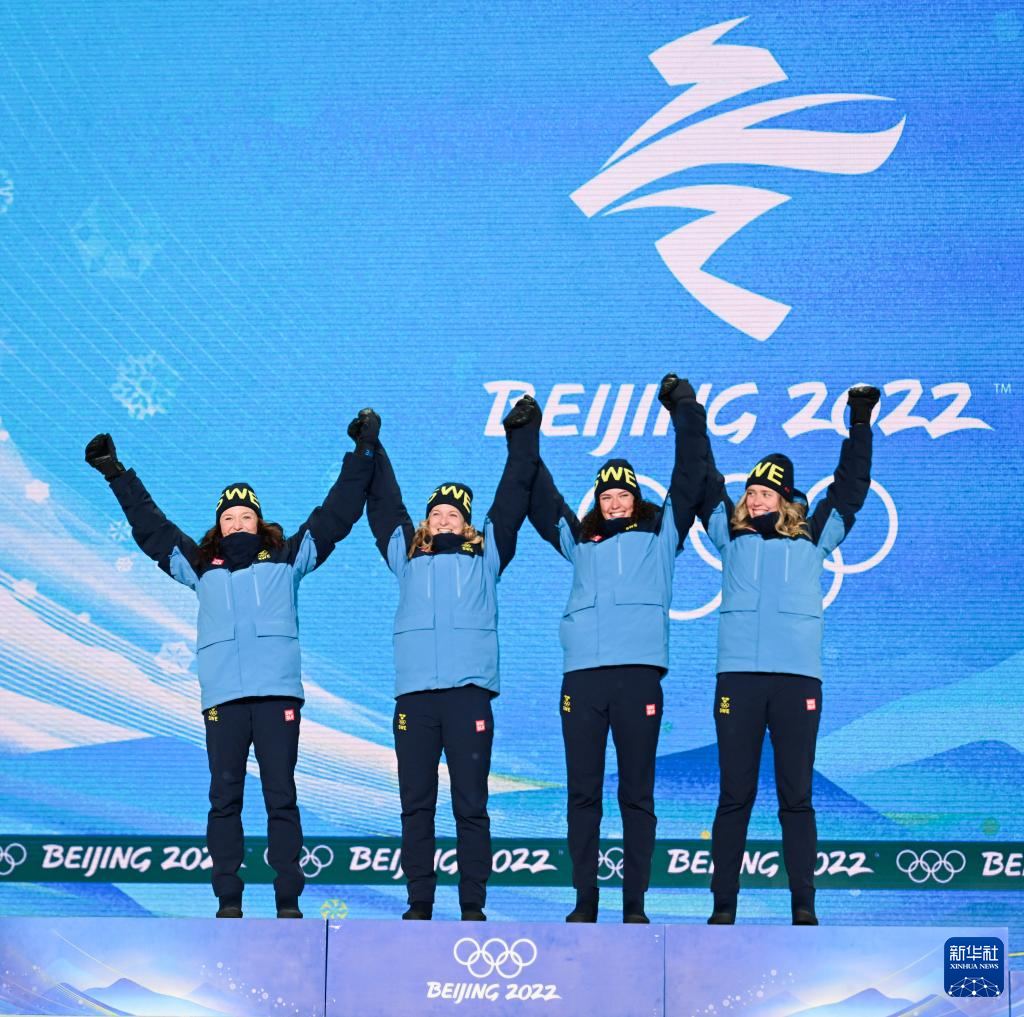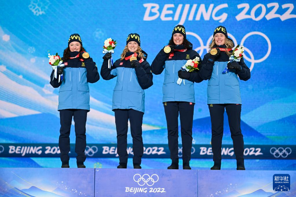 Gold medalists of Sweden pose during the awarding ceremony of biathlon women's 4x6km relay at Zhangjiakou Medals Plaza of the Winter Olympics in Zhangjiakou, north China's Hebei Province, Feb. 17, 2022. (Xinhua/Mu Yu)