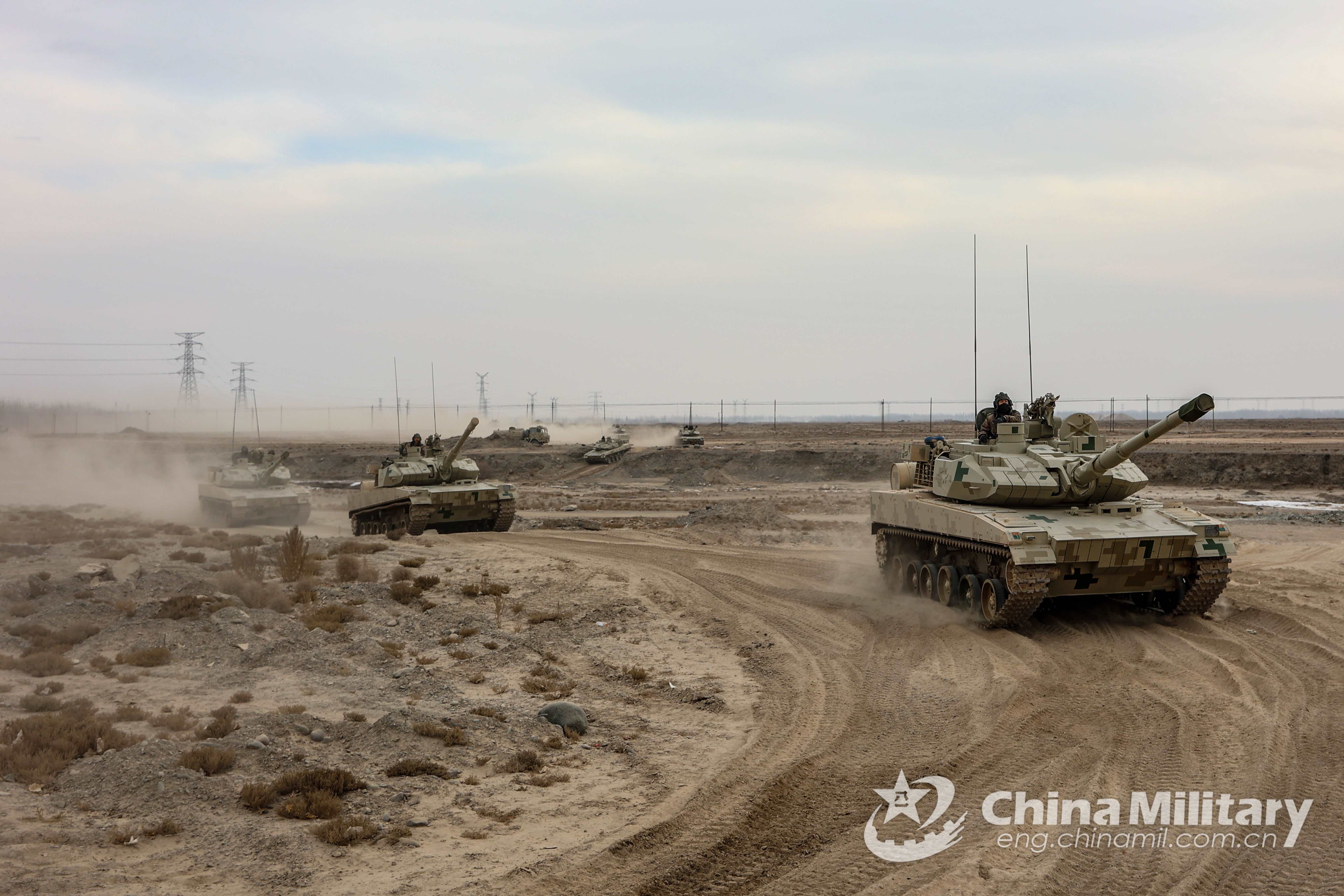 A group of main battle tanks (MBTs) attached to a combined-arms regiment under the PLA Nanjiang Military Command rumble through the desert to the designated area for field training on February 9, 2022. (eng.chinamil.com.cn/Photo by Gao Yang)