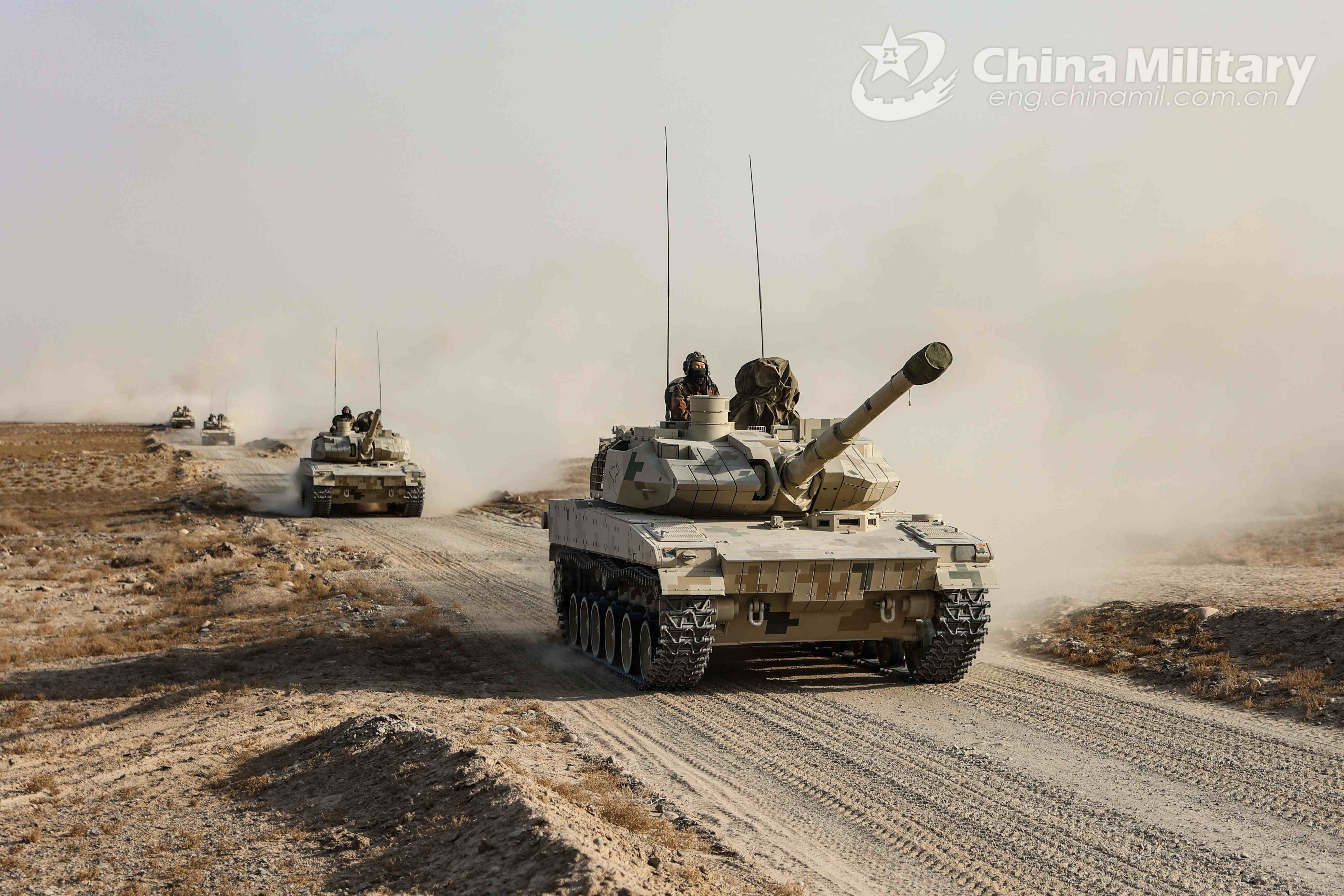 A group of main battle tanks (MBTs) attached to a combined-arms regiment under the PLA Nanjiang Military Command rumble through the desert to the designated area for field training on February 9, 2022. (eng.chinamil.com.cn/Photo by Gao Yang)