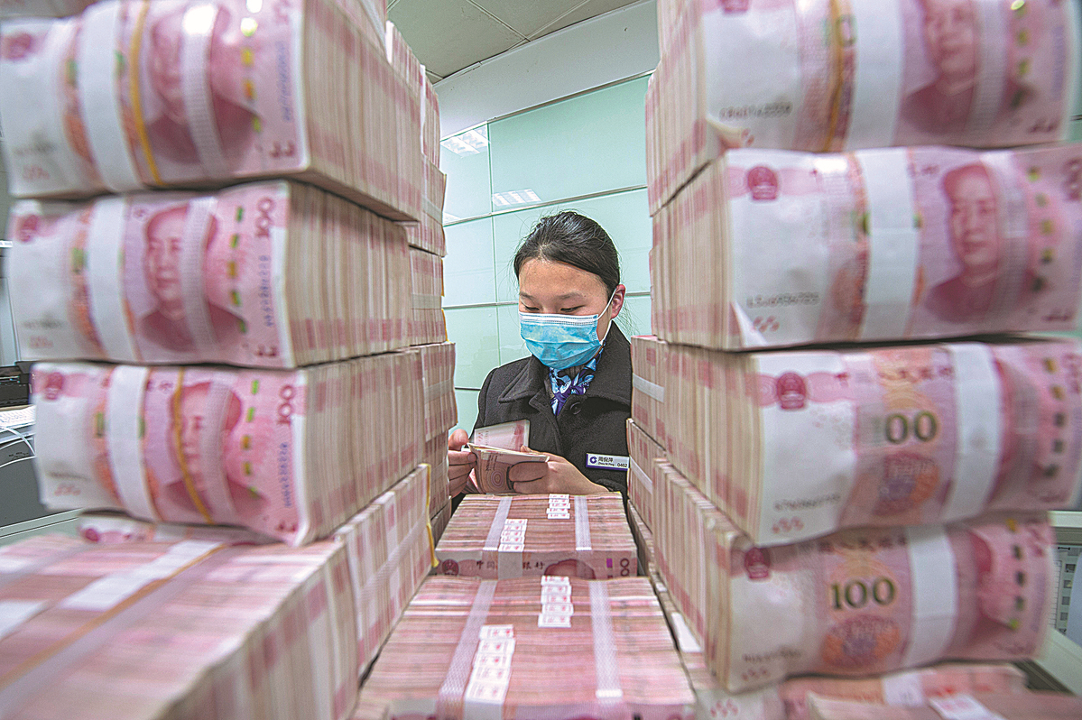 A teller counts cash at a bank in Nantong, Jiangsu province. [Photo by Xu Jingbai/for China Daily]