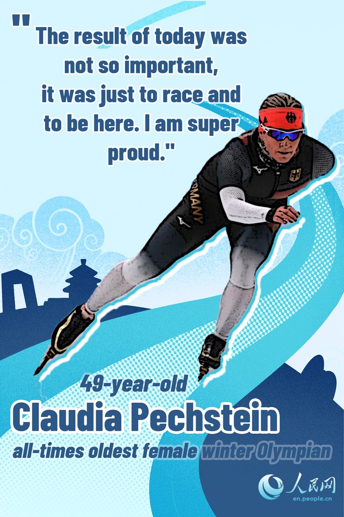 The 49-year-old German speed skater Claudia Pechstein became the oldest woman ever to compete at the Winter Olympic Games and the second athlete — and the only woman — to compete in eight Winter Games when she raced in the 3,000-meter speed skating event at the Beijing 2022.