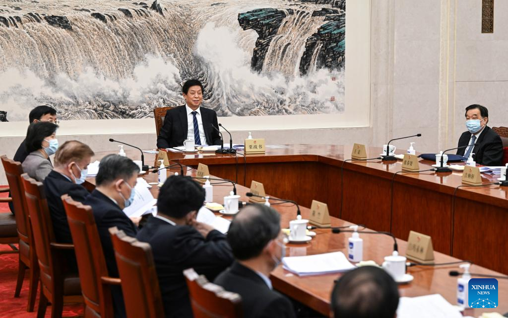 Li Zhanshu, chairman of the National People's Congress (NPC) Standing Committee, presides over a meeting of the Council of Chairpersons of the NPC Standing Committee at the Great Hall of the People in Beijing, capital of China, Feb. 18, 2022. (Xinhua/Rao Aimin)