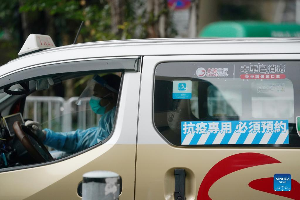 A taxi driver who volunteers to help fight the COVID-19 pandemic stands by along a street in Hong Kong, south China, Feb. 18, 2022. (Xinhua/Wang Shen)