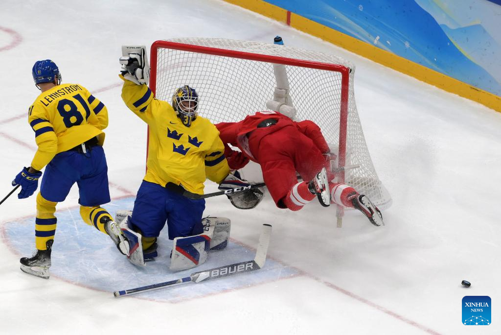 Lars Johansson (2nd L) of Sweden competes during the ice hockey men's play-off semifinal of Beijing 2022 Winter Olympics between ROC and Sweden at National Indoor Stadium in Beijing, capital of China, Feb. 18, 2022. (Xinhua/Li An)