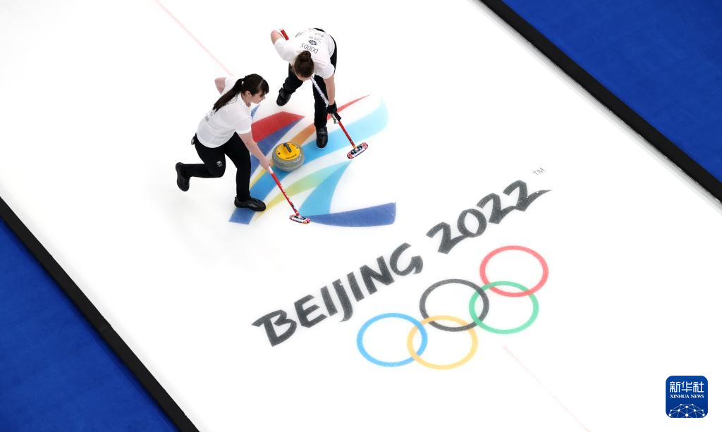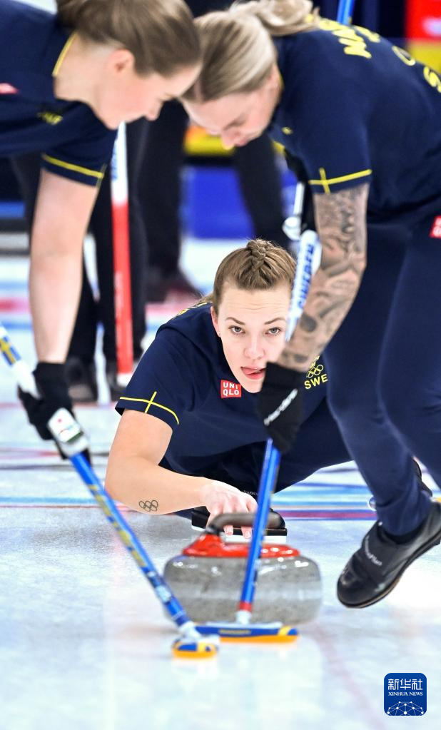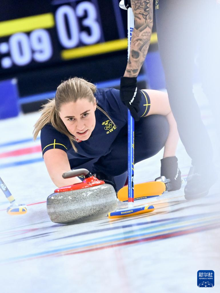 Athletes of Sweden compete during curling woman's semifinal of the Beijing 2022 Winter Olympics between Sweden and Britain at the National Aquatics center in Beijing, China, Feb.18, 2022. (Xinhua/Huang Xiaobang)