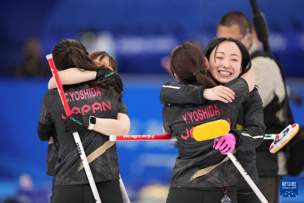 Athletes of Japan celebrate after winning curling woman's semifinal of the Beijing 2022 Winter Olympics between Japan and Switzerland at the National Aquatics center in Beijing, China, Feb.18, 2022. (Xinhua/Zhou Mi)