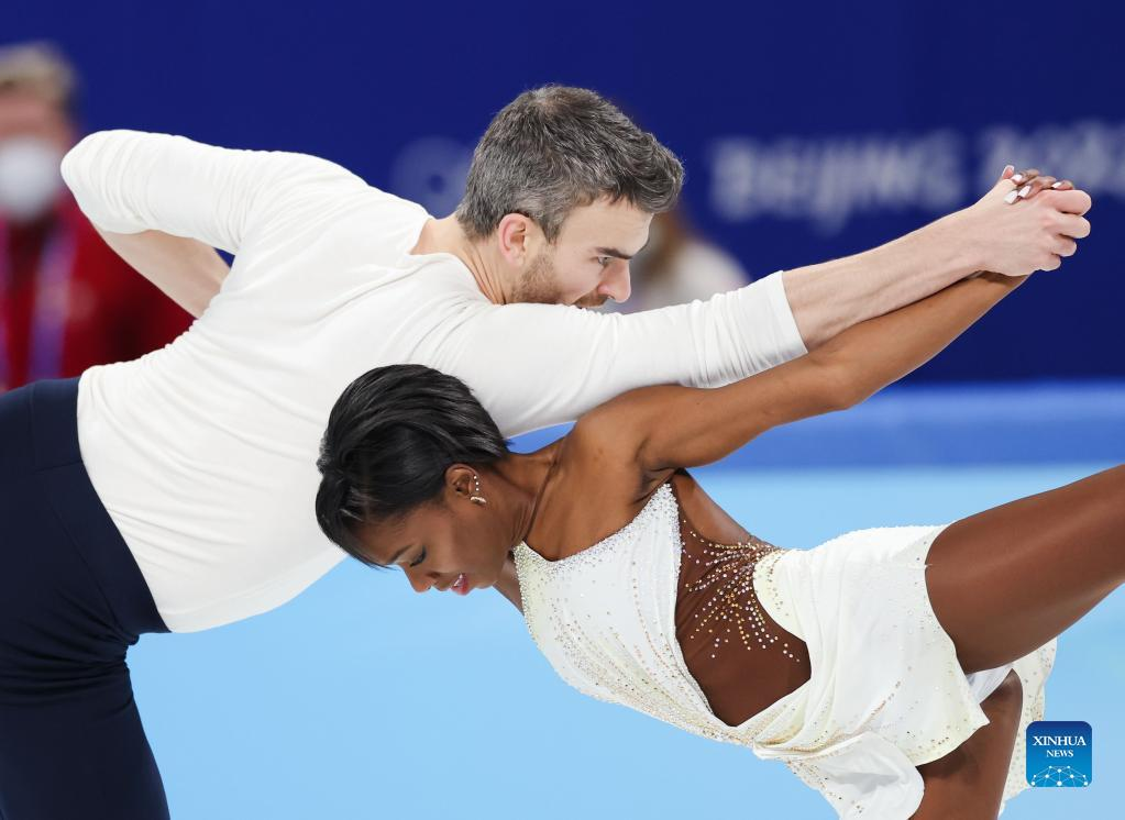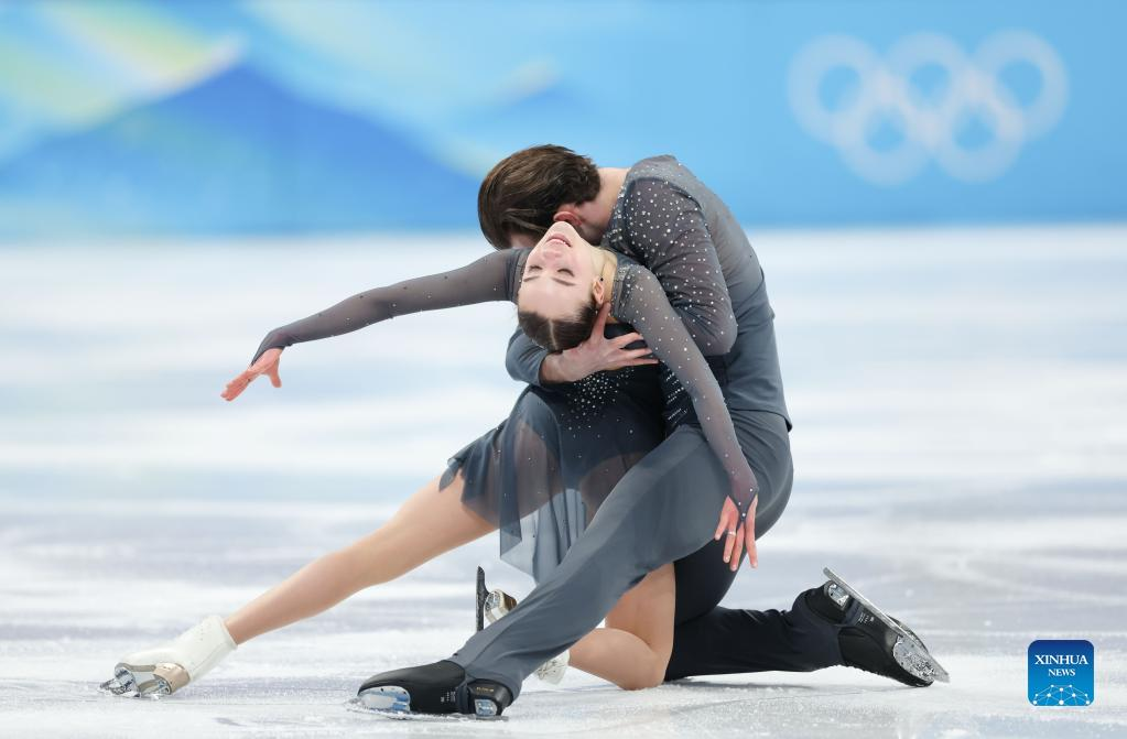 Vanessa James(R)/Eric Radford of Canada perform during the figure skating pair skating short program at Capital Indoor Stadium in Beijing, capital of China, Feb. 18, 2022. (Xinhua/Cao Can)