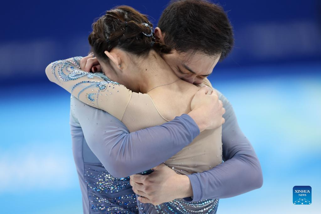Peng Cheng (L) hugs Jin Yang of China during the figure skating pair skating short program at Capital Indoor Stadium in Beijing, capital of China, Feb. 18, 2022. (Xinhua/Lan Hongguang)