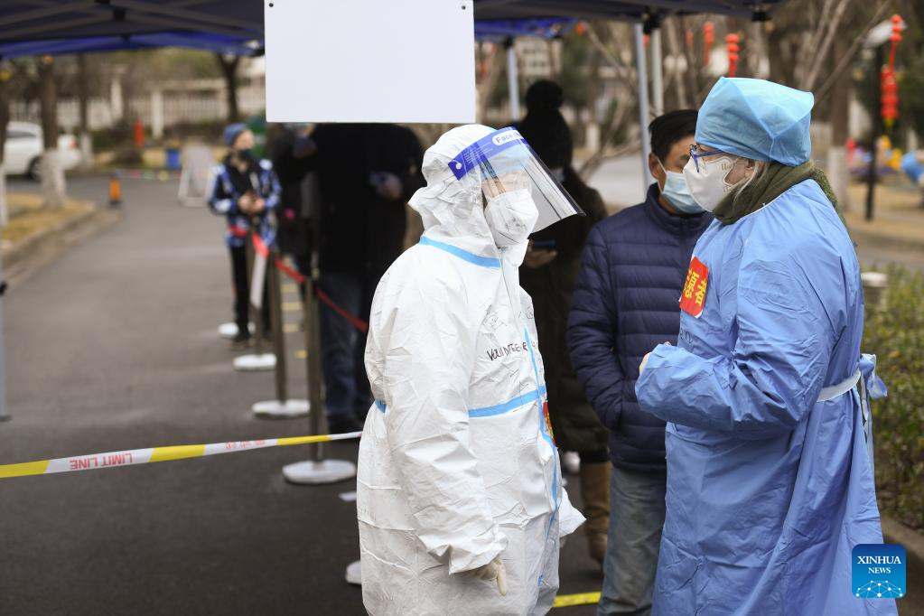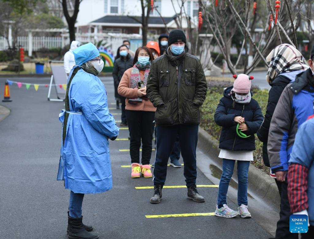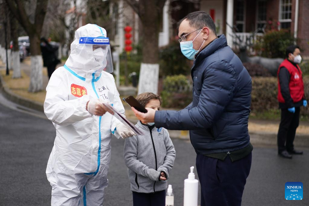 A foreign resident takes COVID-19 test at a COVID-19 testing site in the Suzhou Industrial Park in Suzhou, east China's Jiangsu Province, Feb. 18, 2022. The Suzhou Industrial Park launched its third round of COVID-19 nucleic acid testing on Friday. In order to facilitate foreigners living in the region to take COVID-19 tests, American volunteers Ellen Touchstone and Dinh Thang, together with other language volunteers, provided service at the COVID-19 testing site, helping fight against the latest COVID-19 resurgence in Suzhou. (Xinhua/Ji Chunpeng)