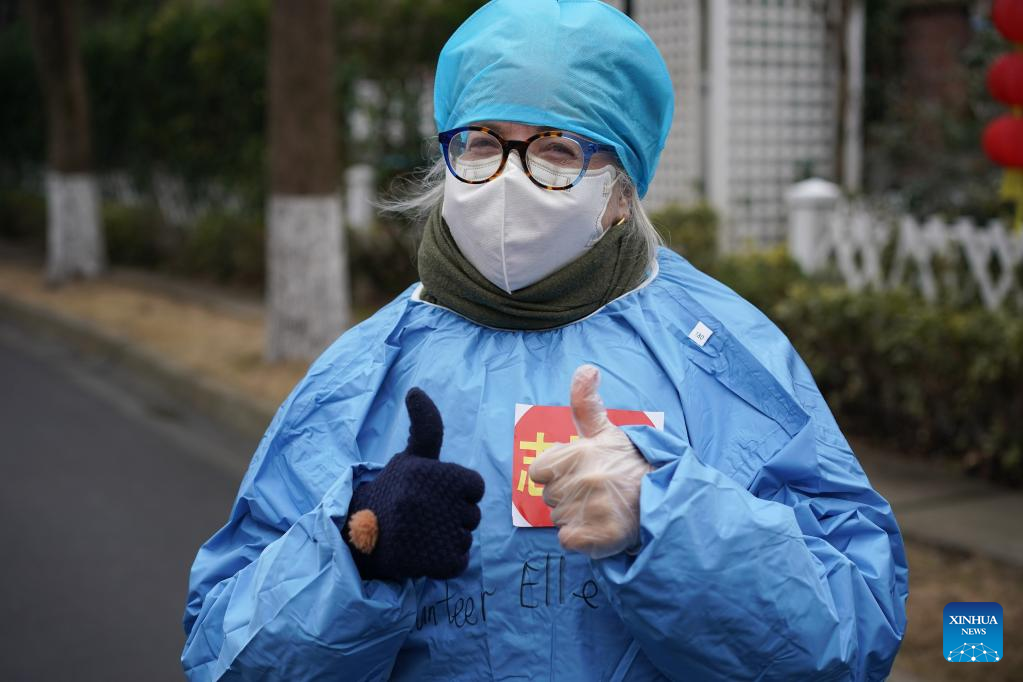 Ellen Touchstone thumbs up at a COVID-19 testing site in the Suzhou Industrial Park in Suzhou, east China's Jiangsu Province, Feb. 18, 2022. The Suzhou Industrial Park launched its third round of COVID-19 nucleic acid testing on Friday. In order to facilitate foreigners living in the region to take COVID-19 tests, American volunteers Ellen Touchstone and Dinh Thang, together with other language volunteers, provided service at the COVID-19 testing site, helping fight against the latest COVID-19 resurgence in Suzhou. (Xinhua/Ji Chunpeng)