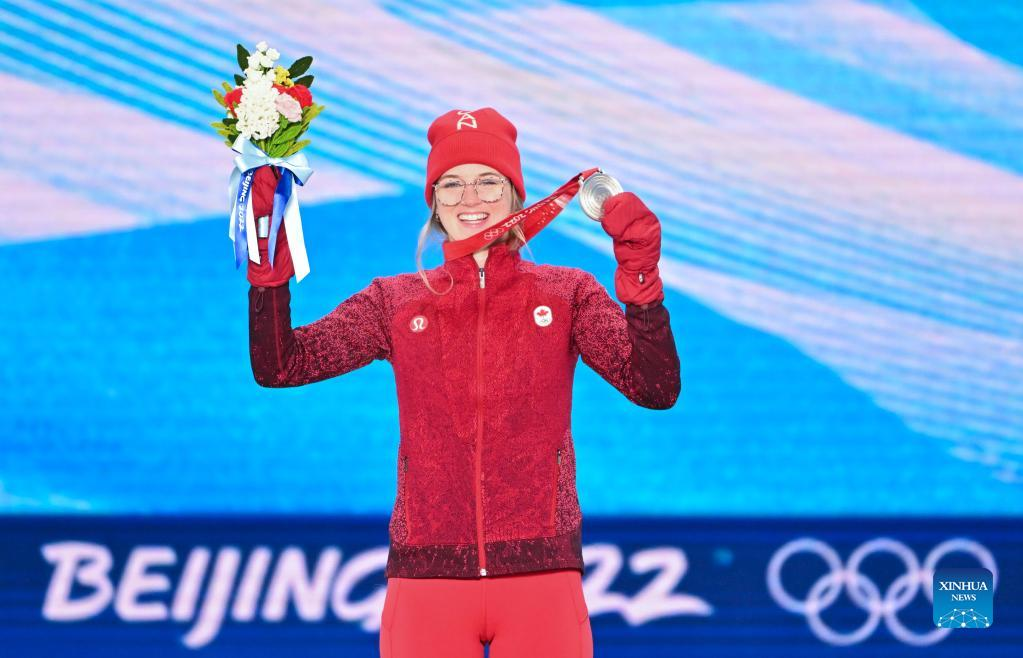Silver medalist Canadian athlete Cassie Sharpe poses during the awarding ceremony of freestyle skiing women's freeski halfpipe at Zhangjiakou Medals Plaza of the Winter Olympics in Zhangjiakou, north China's Hebei Province, Feb. 18, 2022. (Xinhua/Zhu Zheng)