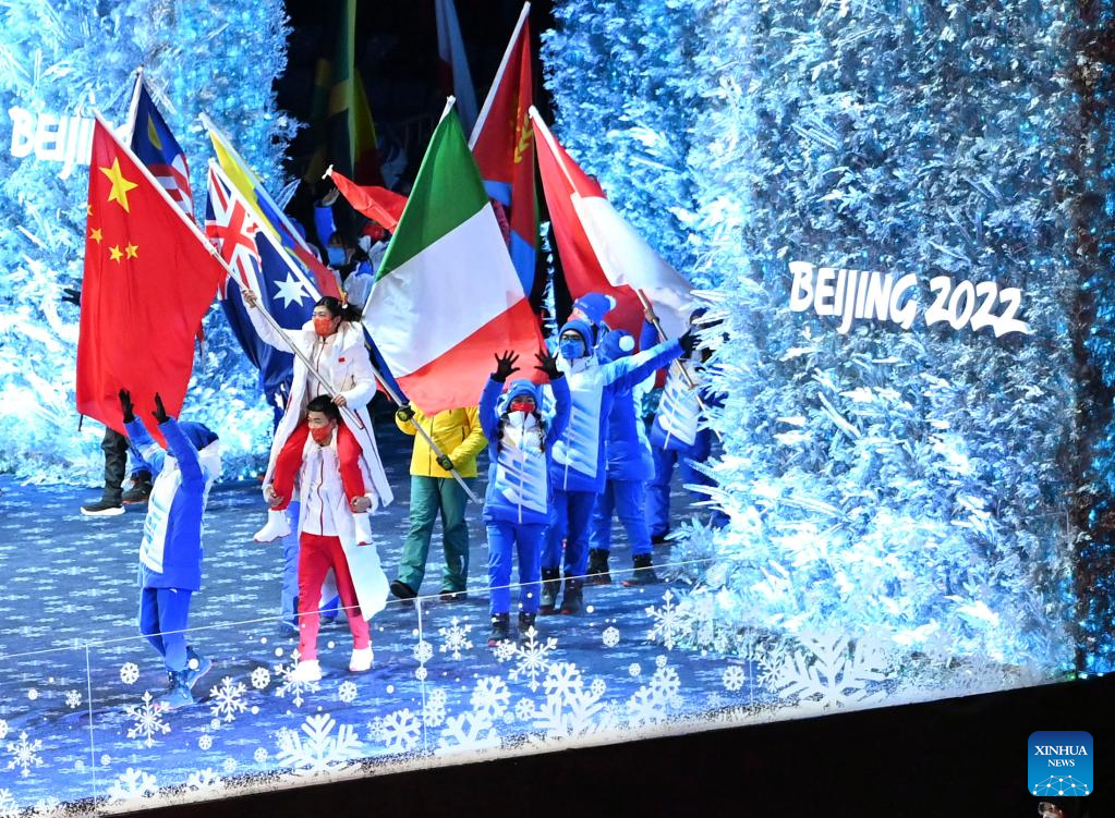 The national flag of Italy is raised during the closing ceremony of the Beijing 2022 Olympic Winter Games at the National Stadium in Beijing, capital of China. (Xinhua/Xu Zijian)