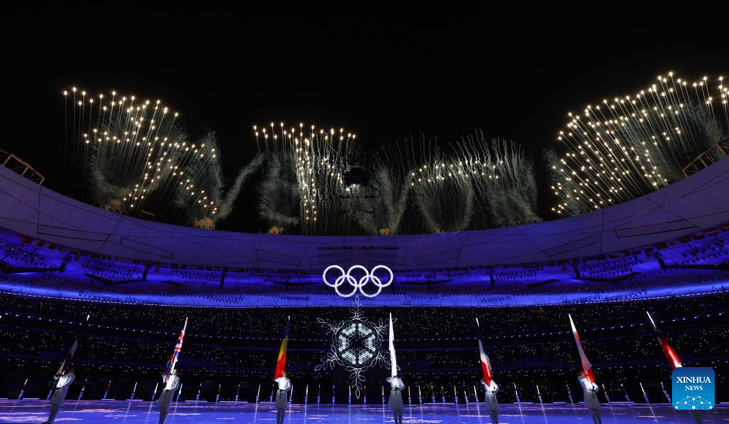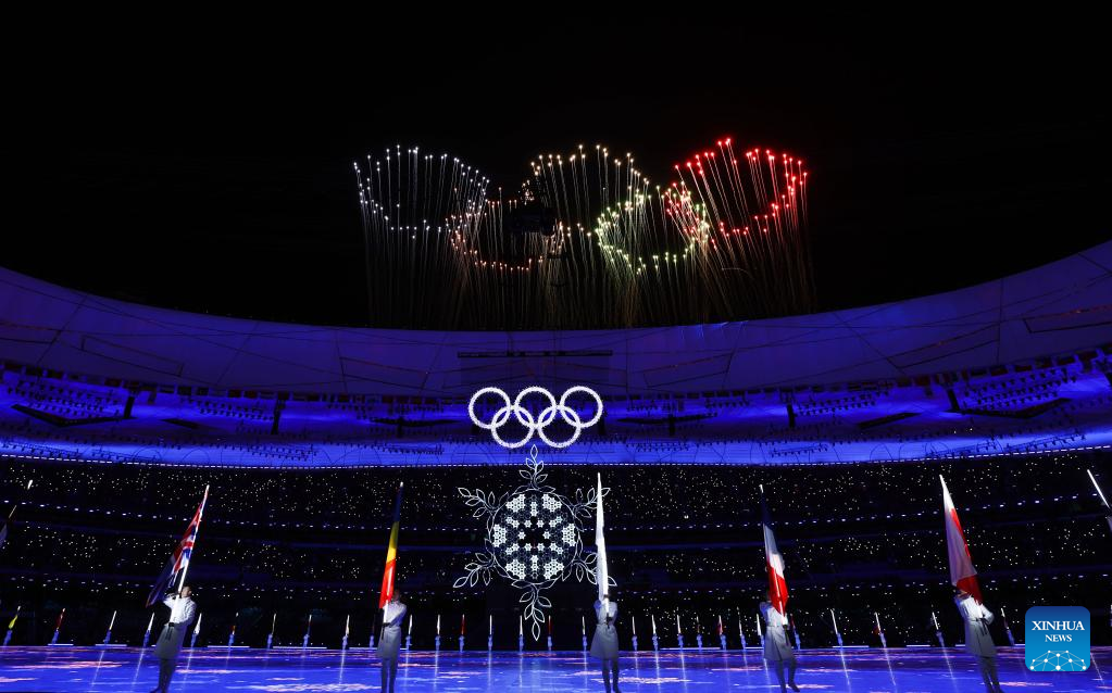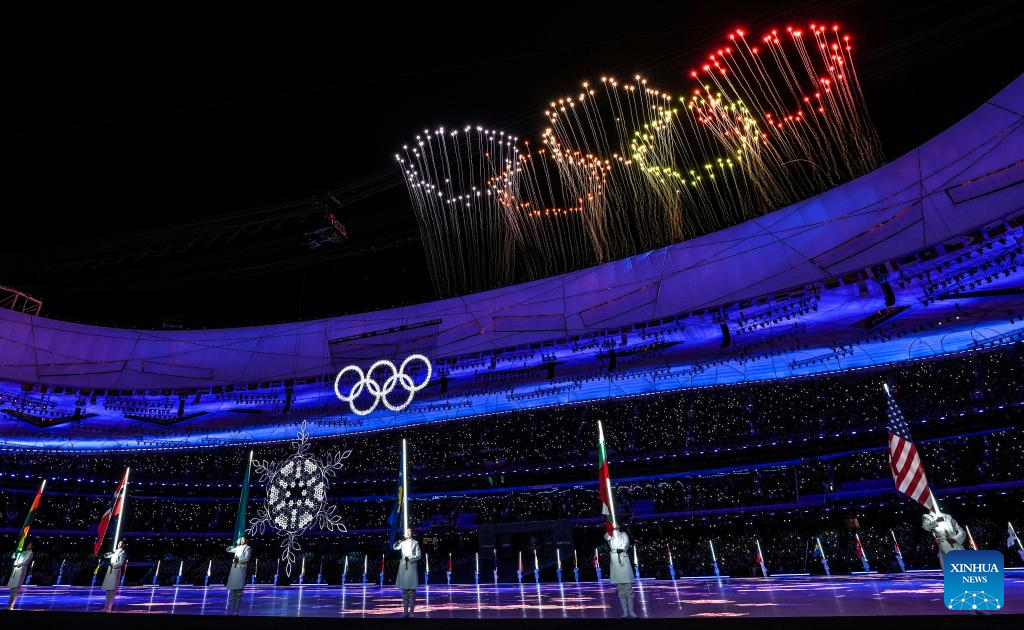 Fireworks illuminate the night sky during the closing ceremony of the Beijing 2022 Olympic Winter Games at the National Stadium in Beijing, capital of China, Feb. 20, 2022. (Xinhua/Li Ga)