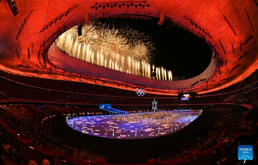 Fireworks illuminate the night sky during the closing ceremony of the Beijing 2022 Olympic Winter Games at the National Stadium in Beijing, capital of China, Feb. 20, 2022. (Xinhua/Cao Can)