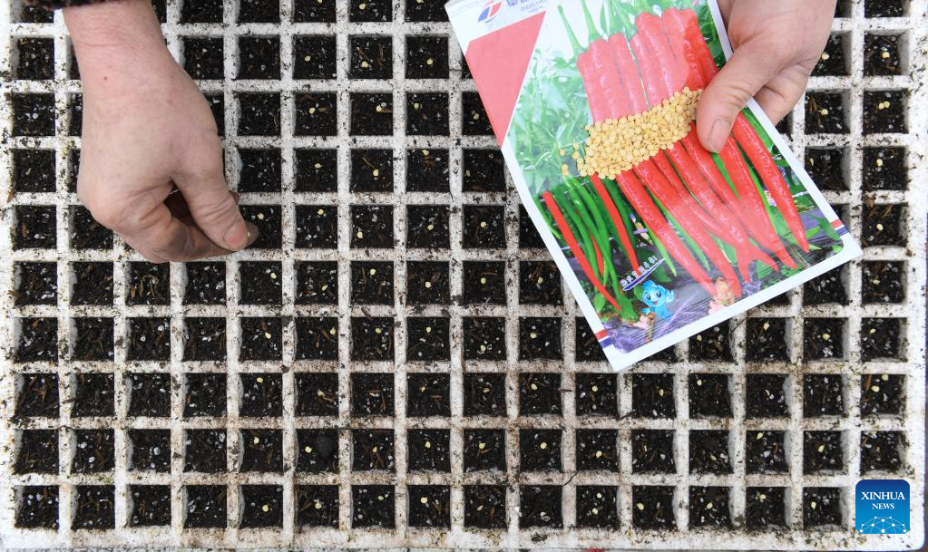A farmer sows chili seeds in Yangchanghe Village of Qiannan Buyi and Miao Autonomous Prefecture, southwest China's Guizhou Province, Feb. 19, 2022. Saturday marks the day of Yushui, or Rain Water, the second of the solar terms. As Yushui arrives, the temperature will rise and rain will become frequent. Farmers across Guizhou are busy with spring agricultural production. (Photo by Cai Xingwen/Xinhua)