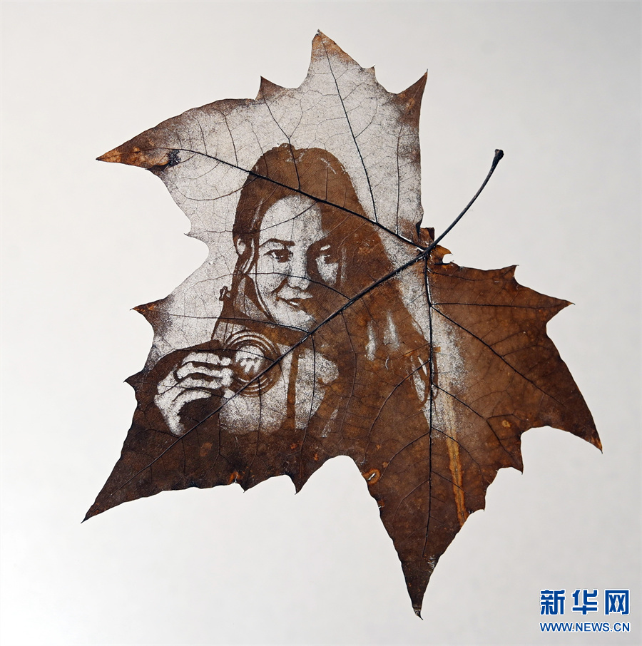 Photo shows Chen Liming’s leaf carving work with an image of Chinese speed skater Wu Dajing. (Photo/Yang Fan)
