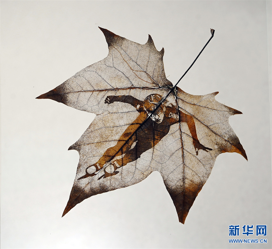 Photo shows Chen Liming’s leaf carving work with an image of a speed skater. (Photo/Yang Fan)