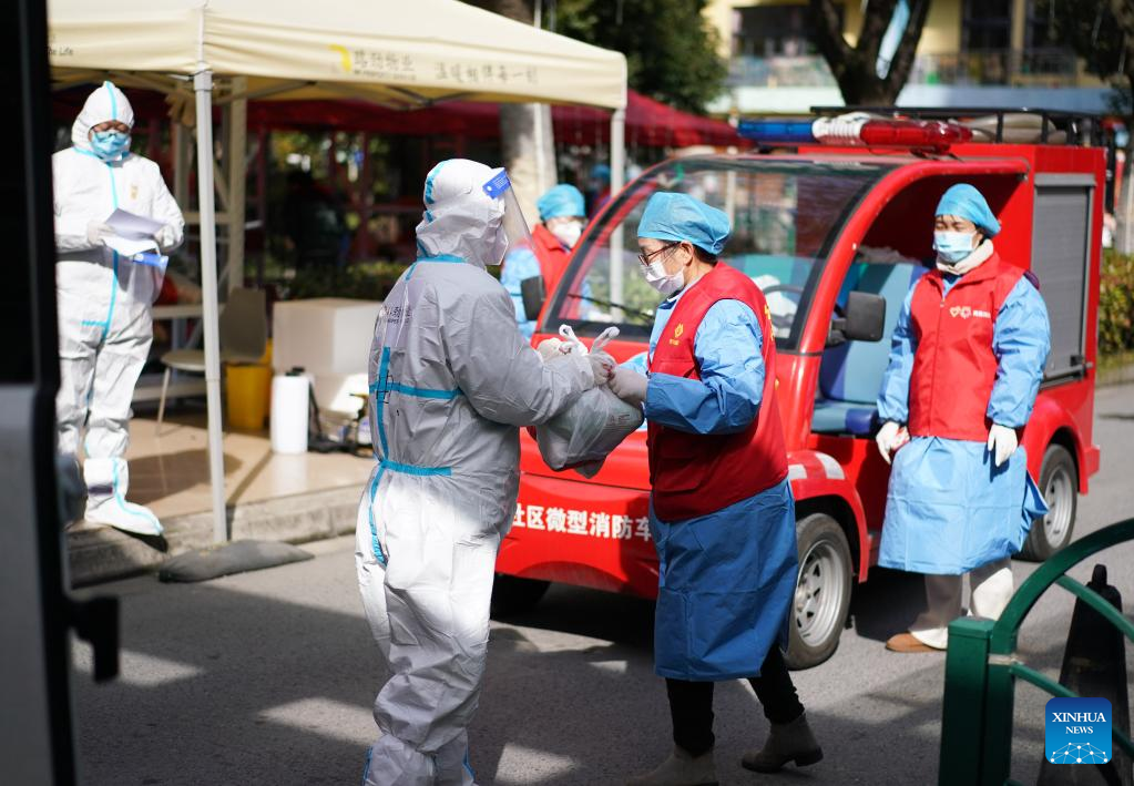 A volunteer takes vegetable packages from a staff member at Suzhou Industrial Park in Suzhou, east China's Jiangsu Province, Feb. 20, 2022. A number of large supermarkets at Suzhou Industrial Park have been mobilized to provide vegetable packages for residents in quarantine to meet their daily needs since the recent resurgence of COVID-19 cases in the city. (Xinhua/Ji Chunpeng)