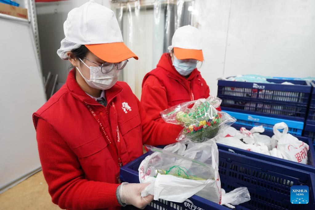 Supermarket workers prepare vegetable packages at Suzhou Industrial Park in Suzhou, east China's Jiangsu Province, Feb. 20, 2022. A number of large supermarkets at Suzhou Industrial Park have been mobilized to provide vegetable packages for residents in quarantine to meet their daily needs since the recent resurgence of COVID-19 cases in the city. (Xinhua/Ji Chunpeng)