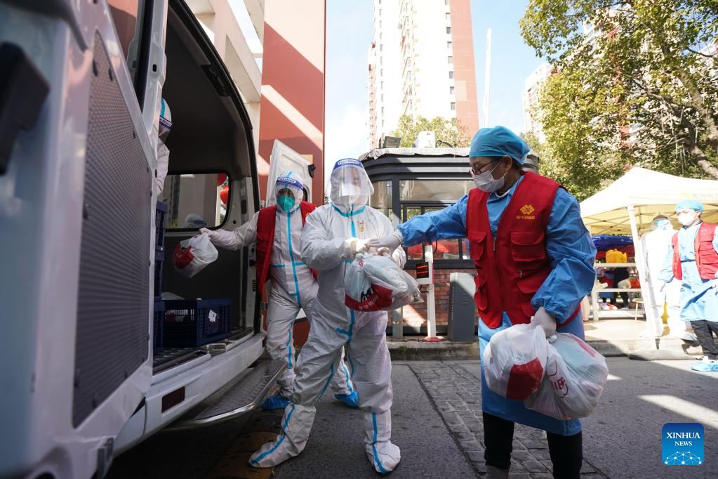 A volunteer takes vegetable packages from a staff member at Suzhou Industrial Park in Suzhou, east China's Jiangsu Province, Feb. 20, 2022. A number of large supermarkets at Suzhou Industrial Park have been mobilized to provide vegetable packages for residents in quarantine to meet their daily needs since the recent resurgence of COVID-19 cases in the city. (Xinhua/Ji Chunpeng)