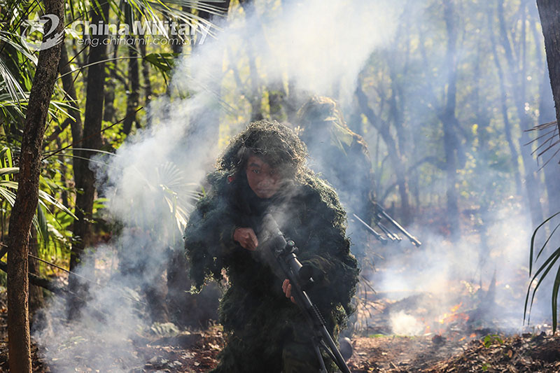 Camouflaged soldiers assigned to a brigade under the PLA 72nd Group Army provide security in turns to cover for the advancement to a mock enemy position during a tactical training course on February 9, 2022. The training aimed at verifying the troops' battle-field reconnaissance capability. (eng.chinamil.com.cn/Photo by Gui Fangqing)