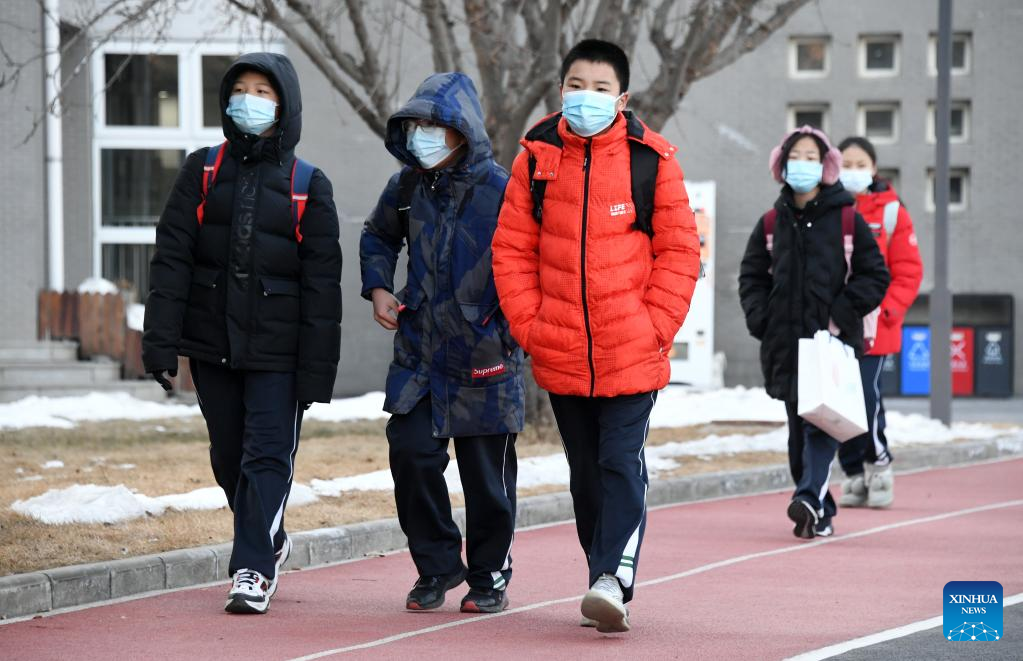 Students walk on campus of the High School Affiliated to China Agricultural University in Beijing, capital of China, Feb. 21, 2022.