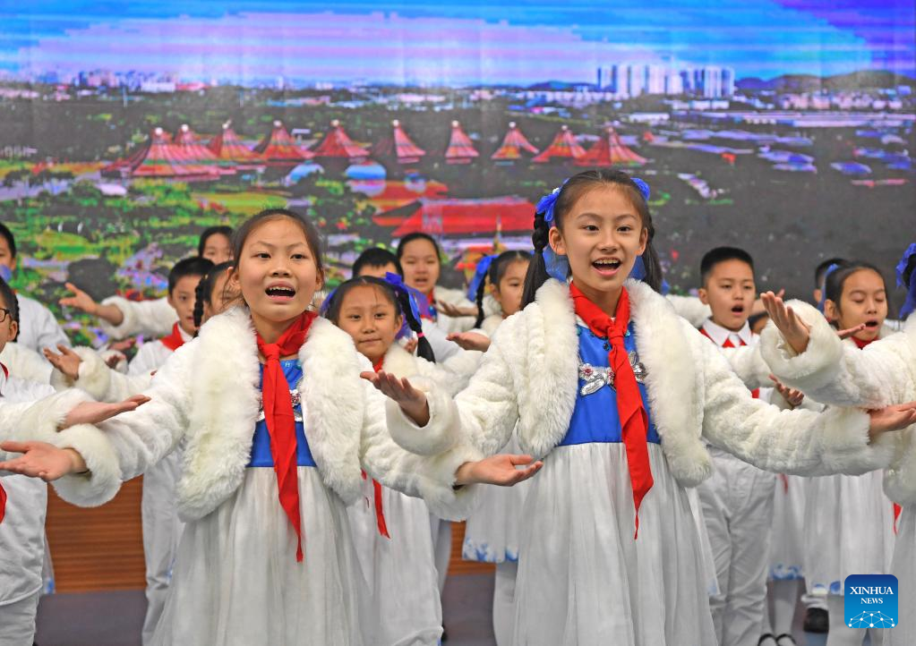 Students stage a performance in Binhulu Primary School in Nanning, south China's Guangxi Zhuang Autonomous Region, Feb. 21, 2022.