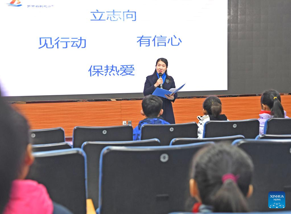 Students sing a song in Binhulu Primary School in Nanning, south China's Guangxi Zhuang Autonomous Region, Feb. 21, 2022.
