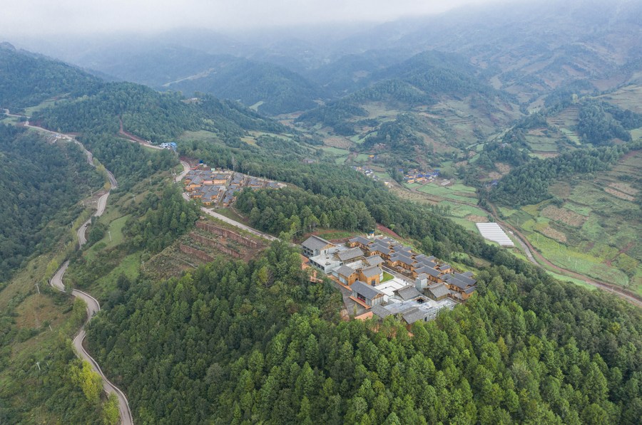 Aerial photo taken on Oct. 13, 2020 shows a resettlement area at Sanhe Village in Zhaojue County, Liangshan Yi Autonomous Prefecture, southwest China's Sichuan Province. (Xinhua/Zhang Xiaoyu)