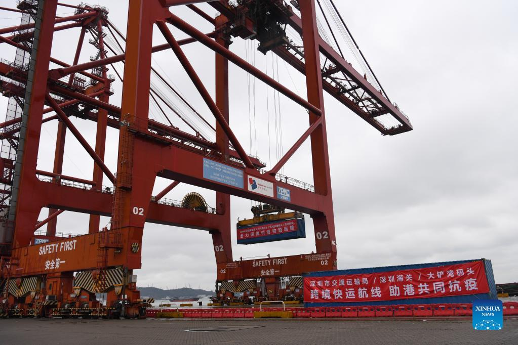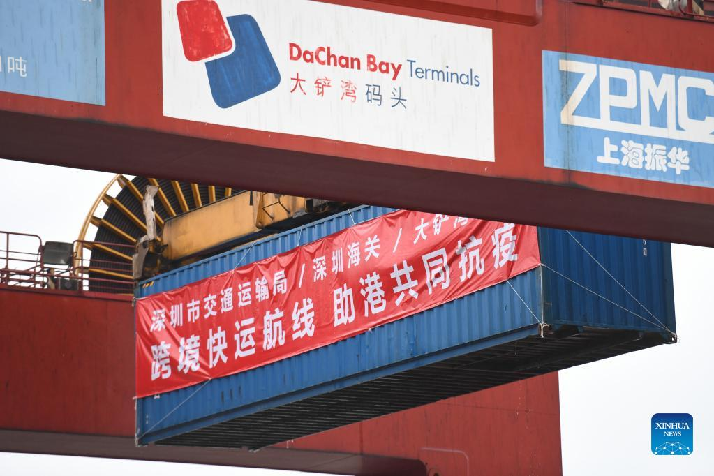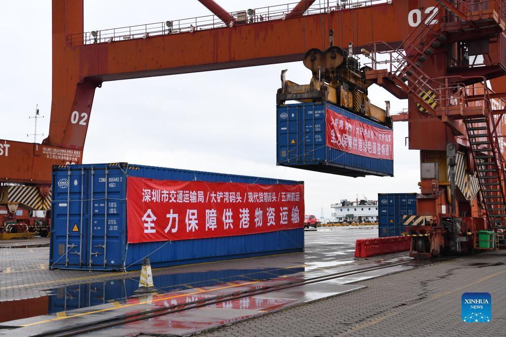 Containers carrying supplies for Hong Kong are seen at Dachanwan wharf of Shenzhen port, south China's Guangdong Province, Feb. 21, 2022. Port zones in Shenzhen have been trying to optimize waterway transport channels for daily supplies to residents in Hong Kong, which is hit by a new round of COVID-19 outbreak. (Xinhua/Liang Xu)