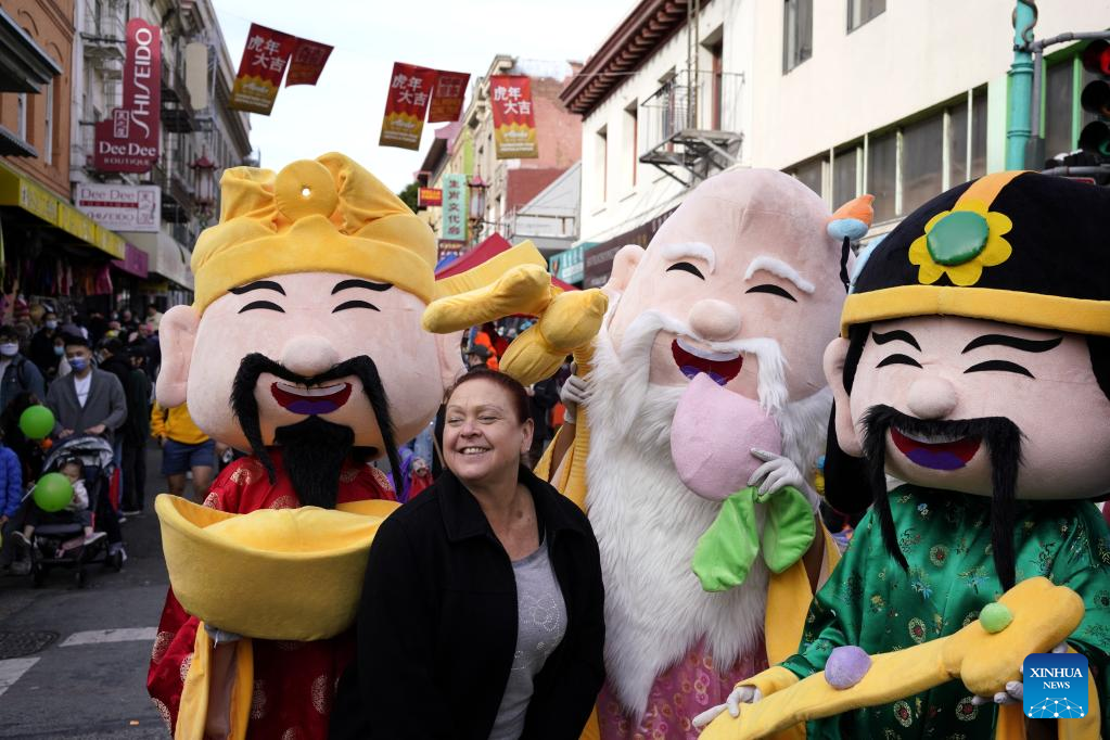 Tourists pose for a photo with actors who dressed as gods of happiness, wealth and longevity respectively during the China town's weekend market in San Francisco, the United States, Feb. 20, 2022. (Xinhua/Wu Xiaoling)